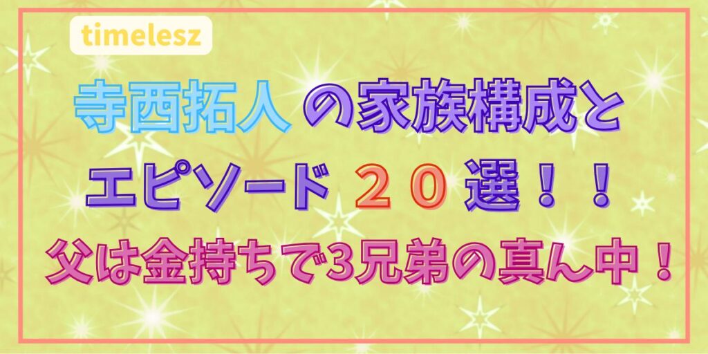 今、timeleszの中でも「国民の元カレ」のキャッチフレーズで爆発的人気を誇る寺西拓人さん。 そんな寺西さんの父親や母親、兄弟はどんな人なのか、とても気になりますよね。 神奈川県川崎市出身の寺西さんは、父・母・兄・妹、そして猫のひでよしの5人家族...