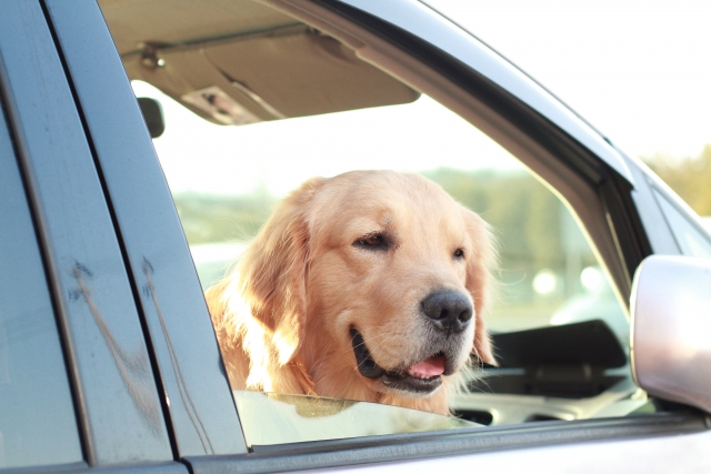 彼女と彼女の愛犬(ゴールデンレトリバー)が乗る車内で